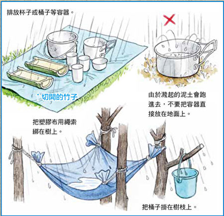 雨水拿來飲用也沒問題。不過,最好等雨下了一段時間之後再收集雨水,因為剛下的雨含有大氣裏的髒污。還有,收集雨水的容器。不要直接放置在地面上,放在地上的話,飛濺起來的水裏可能混有泥土。要在離開地面的枱面上,排放杯子或盤子等手邊所有的容器來收集雨水。