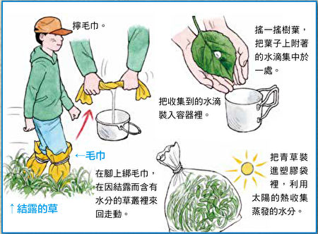 還有一種方法比較需要耐心,是將草或樹葉上附著的水滴直接收集到容器裏。此外,把沾有露水的草放進塑膠袋裏輕輕搖晃,水滴就會集中在袋子底部。重複這個步驟就可以取得飲用水。如果收集到的水含有髒污,煮沸殺菌會比較安全。