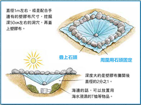 在沙灘的話,放入用海水浸濕的毛巾或草葉,更容易取得大量水份。日光直射到的地方,洞穴裏會升溫使得水份容易蒸發,因此可以找長時間有太陽直射的地點來挖洞。