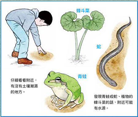 在山裏要找出水湧出的地方。在樹木茂密的山裏,地底下所含的雨水會緩緩滲出。走著走著如果發現土壤潮濕的地方,就仔細看看附近,應該會有水從山坡或岩石的縫隙流出。大多數的地下水經過地底過濾,當成飲用水沒有問題。然而,水塘的水或河水則有可能摻雜了細菌或哺乳類糞便中的寄生蟲等等,不要直接飲用。水源處如果有動物的腳印,水被污染的可能性就很高。