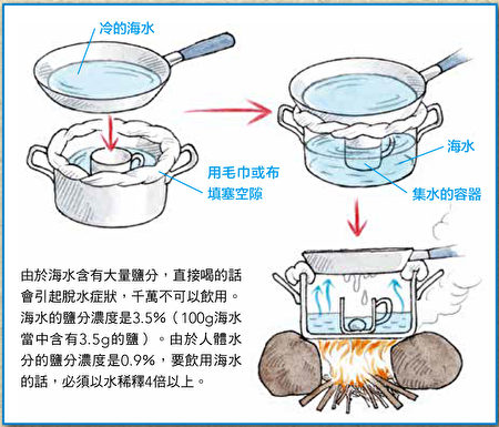 即使是熾熱的沙漠,還是會從地底下不斷冒出水蒸氣,而這些水蒸氣也可以轉換成飲用水。雖然比較費時,但還是要學起來以防萬一。這個方法就是利用太陽熱能的簡易蒸餾法。首先要挖洞,並在洞穴的中央放置容器後,攤開塑膠布完全覆蓋住洞穴。如此一來,地底下的水份受太陽的熱而蒸發,就會在塑膠布的內側產生水滴而滴落至容器裏。為了確保水滴進入容器,可以在容器正上方處的塑膠布上擺一個小石頭。有了這個方法,不管是沙漠還是荒島的沙灘,都能取得飲用水。