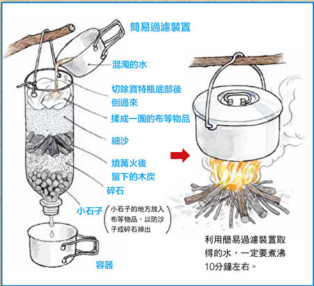 容器最好用大的膠樽(2公升),如上圖製作。用這個裝置過濾,便可以去除水中的雜質。過濾後的水需煮沸,以殺死病菌。除了泉水以外,不管看起來再怎麼乾淨的水,都最好煮沸至少10分鐘以上以殺菌。