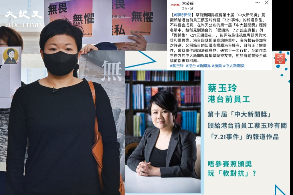 網上流傳一張圖片,指中聯辦控制的《大公報》昨日(15日)在Facebook發文,報道港台前編導蔡玉玲的團體獲「中大新聞獎」頒獎的相關新聞時,配圖錯誤使用了台灣前行政院政務委員蔡玉玲的照片,而非香港的蔡玉玲。