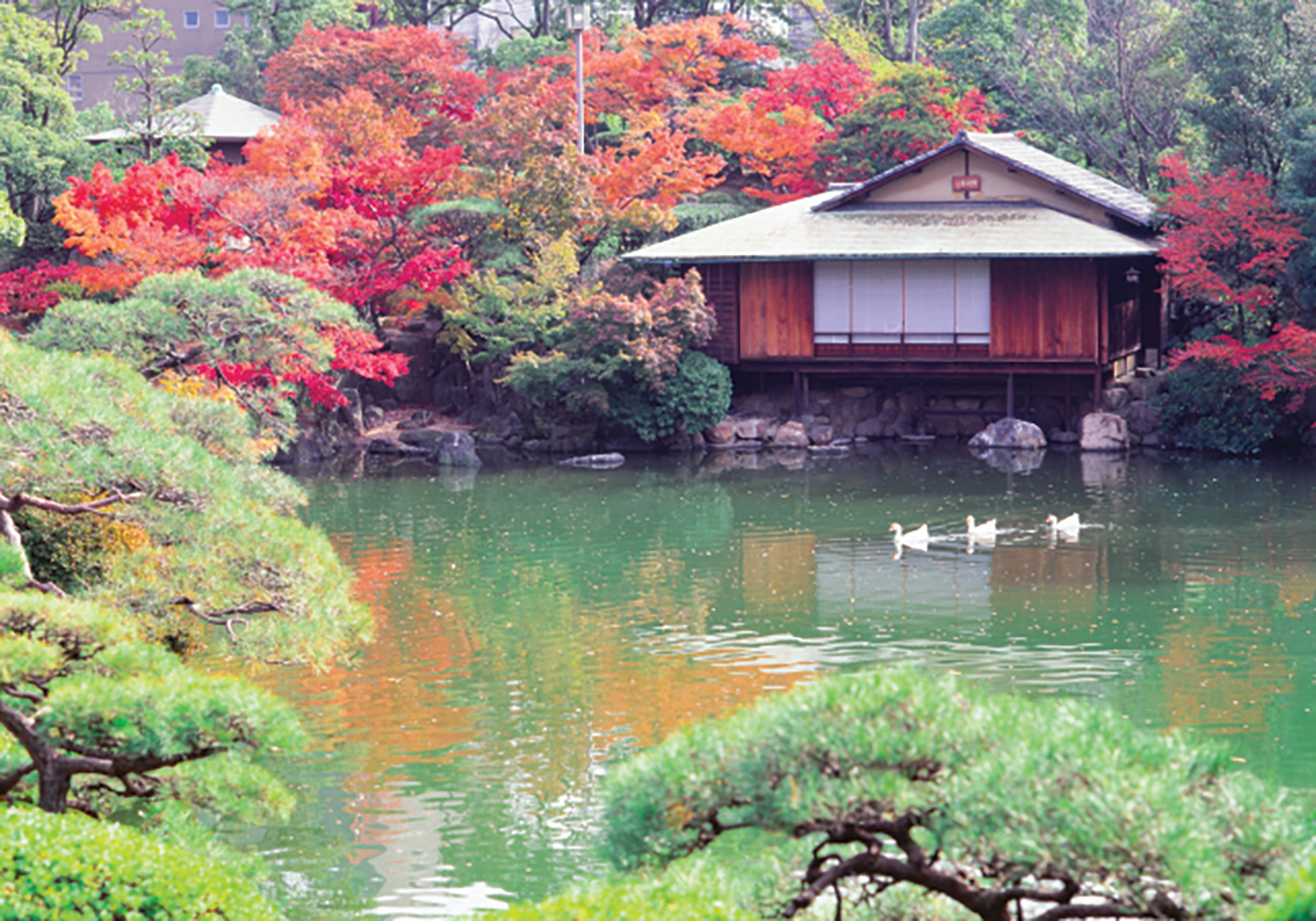 其中池泉迴遊式日本庭園「相樂園」,座落在三宮市街內,佔地約6千坪,園內遍布石橋及池塘,每逢秋季園內繽紛的紅葉倒映在池內,如同畫作一般高雅優美。