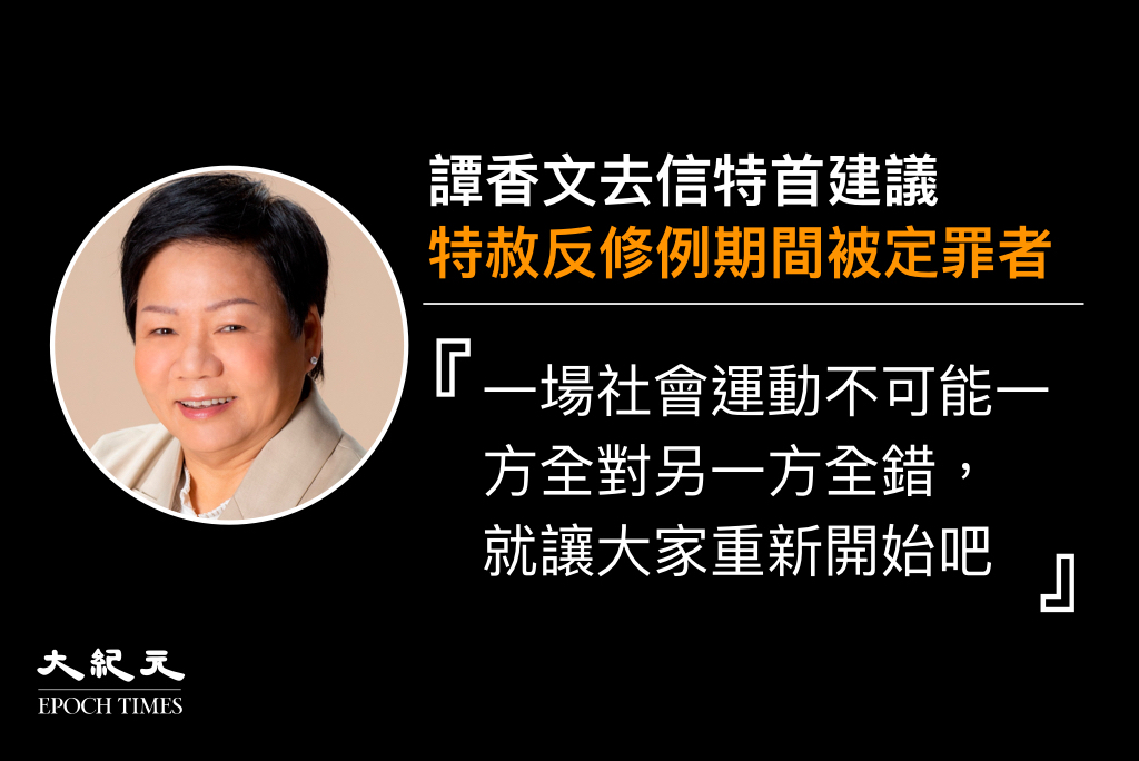被指是「非建制派」的立法會九龍中直選參選人譚香文,昨日去信(11月30日)特首林鄭月娥,要求特赦因反修例運動被定罪的人士,稱「一場社會運動不可能一方全對另一方全錯」,希望大家能重新開始。