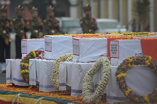 2021年12月9日,印度泰米爾納德邦(Tamil Nadu)威靈頓(Wellington),印度國防參謀長拉瓦特(Bipin Rawat)等13人墜機身亡後,軍方舉行葬禮。(Arun Sankar/AFP via Getty Images)