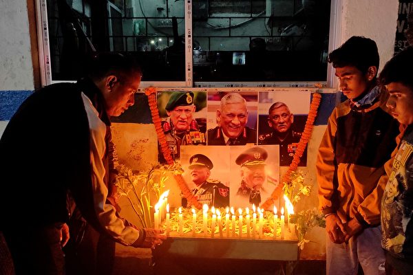 2021年12月8日,印度西裏古裏(Siliguri),一架印度空軍(IAF)Mi-17V5直升機墜毀後,印度國防參謀長拉瓦特(Bipin Rawat)罹難,民眾以燭火悼念。(Diptendu Dutta/AFP via Getty Images)