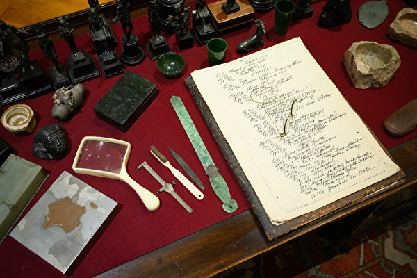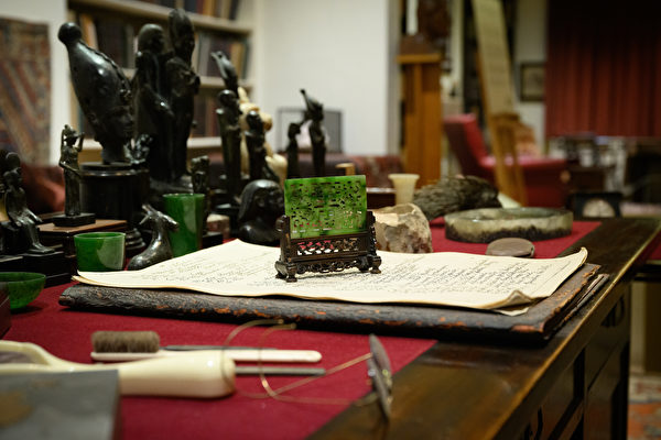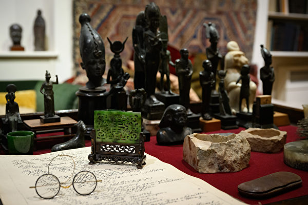 圖片顯示,2月10日,展覽正式開始前,弗洛伊德博物館內呈現弗洛伊德書房的擺設、19世紀中國玉屏風、開信刀及人偶等物品。#