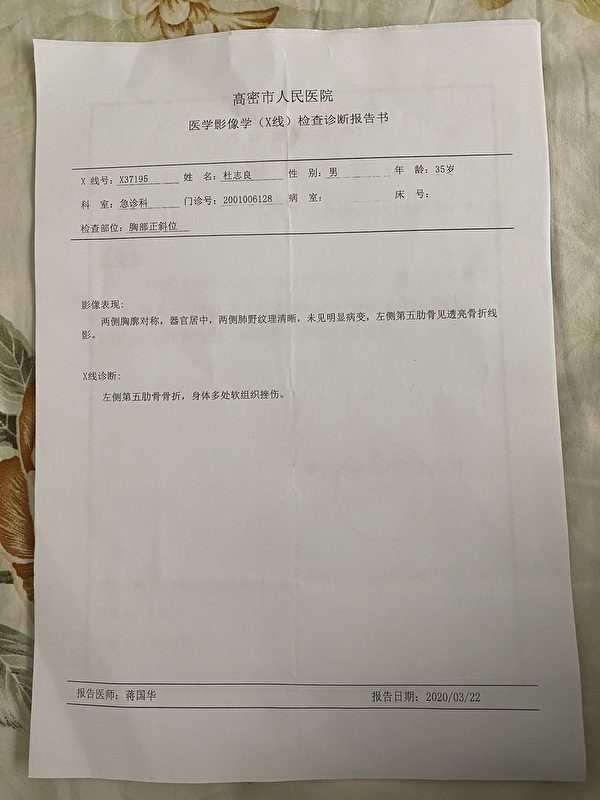 杜志良說,出來之後他直接就去了醫院,做完檢查大約三四點鐘回家,然後第二天下午五點左右又被警察抓去拘留,直到清明前後才被放出來。