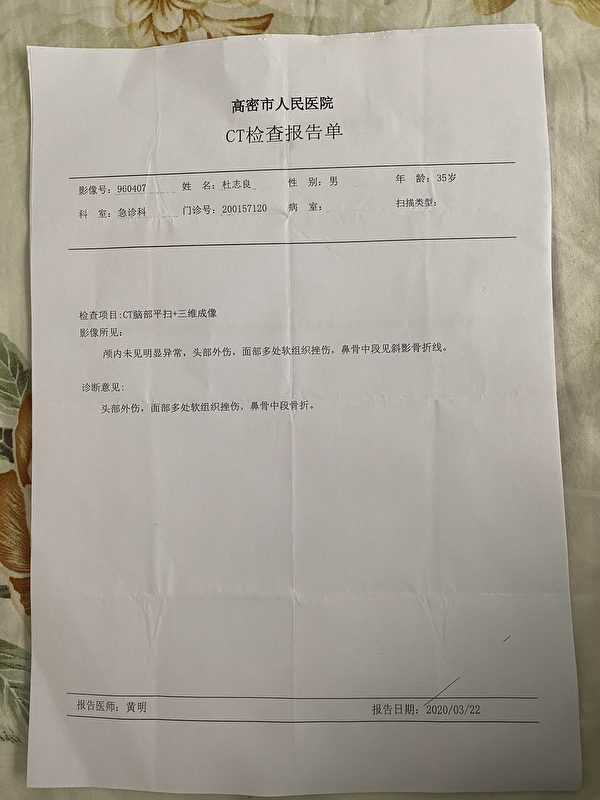 根據杜志良出示的高密市醫院CT腦部掃瞄和X線診斷書顯示,當時杜志良面部多處軟組織挫傷,鼻骨中段骨折,身體左側第五肋骨骨折,並有多處軟組織挫傷。