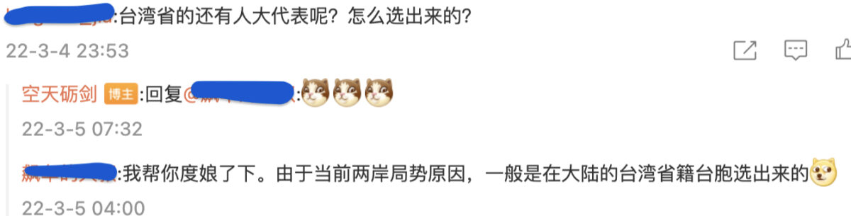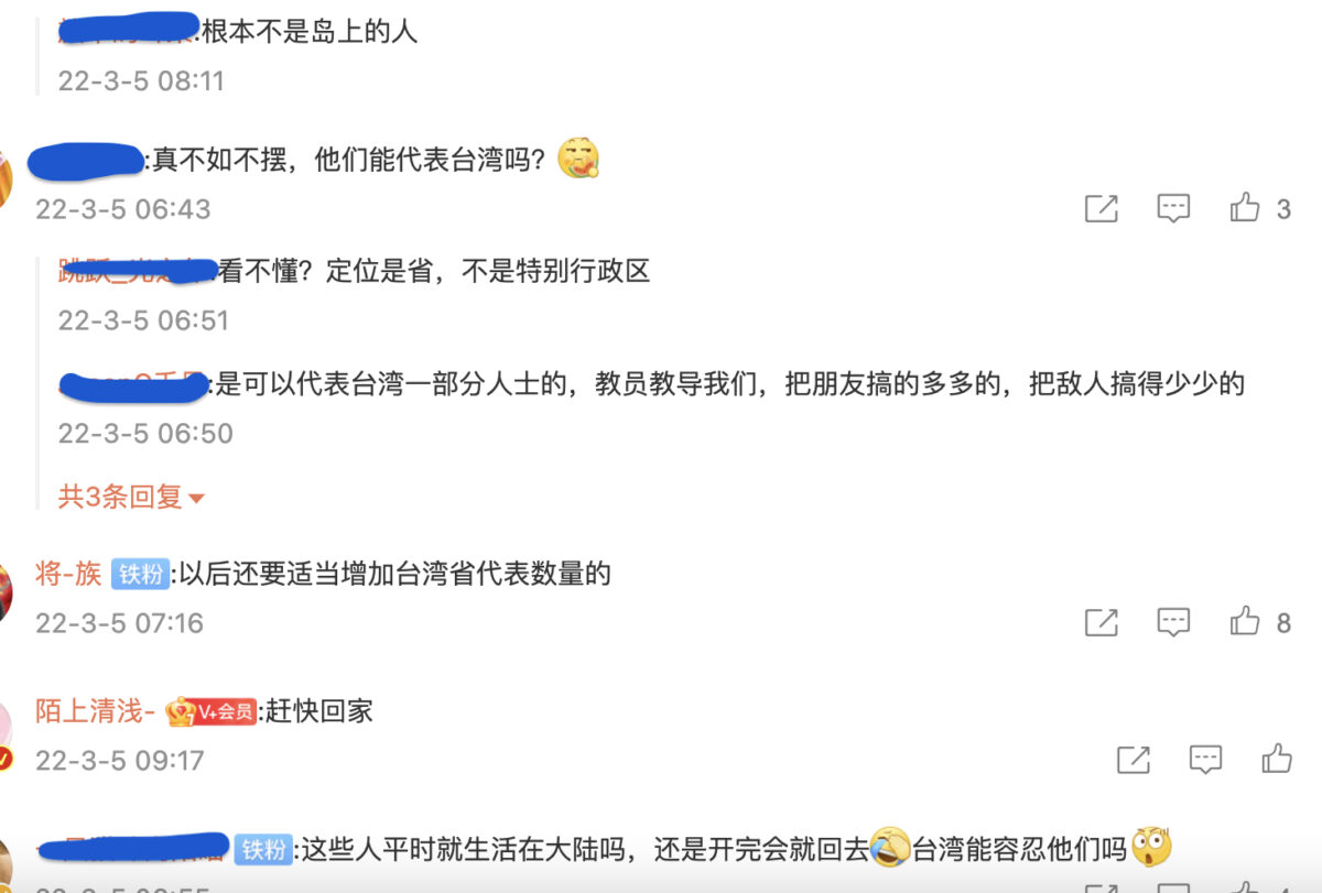 有人質疑「台灣省的還有人大代表呢?怎麼選出來的?」有人回應:「由於當前兩岸局勢原因,一般是在大陸的台灣省籍台胞選出來的 」。