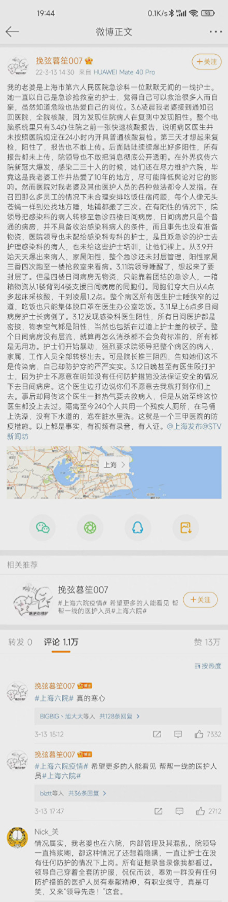 據網友「挽弦暮笙007」3月13日微博發文說,他妻子是上海六醫院急診科一線護士,3月6日凌晨,他妻子接到通知召回醫院,全院核酸檢測,因為發現住院病人在複測中呈現陽性。但電腦系統裏只有3月4日辦住院之前的一張快速核酸報告,說明病區醫生並未按照醫院規定在24小時內開具普通核酸複檢。結果到了第三天複檢查出陽性時,又不敢報告上傳,導致後面陸陸續續爆出好多陽性,但醫院仍然隱瞞,沒有公開消息。