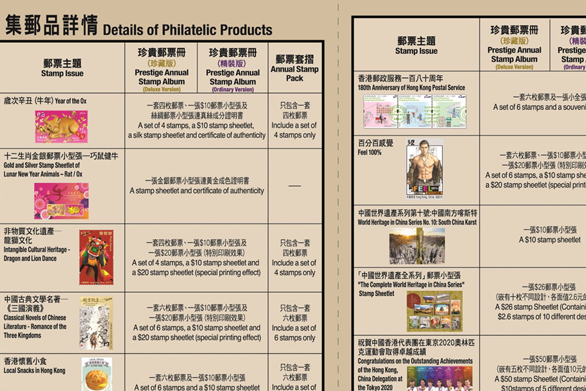 《郵票冊》和《套摺》記錄過去1年香港各類題材及重大事件。《郵票冊》齊集香港郵政2021年內發行的特別或紀念郵票、郵票小型張和小全張。《套摺》則只收錄特別或紀念郵票。@