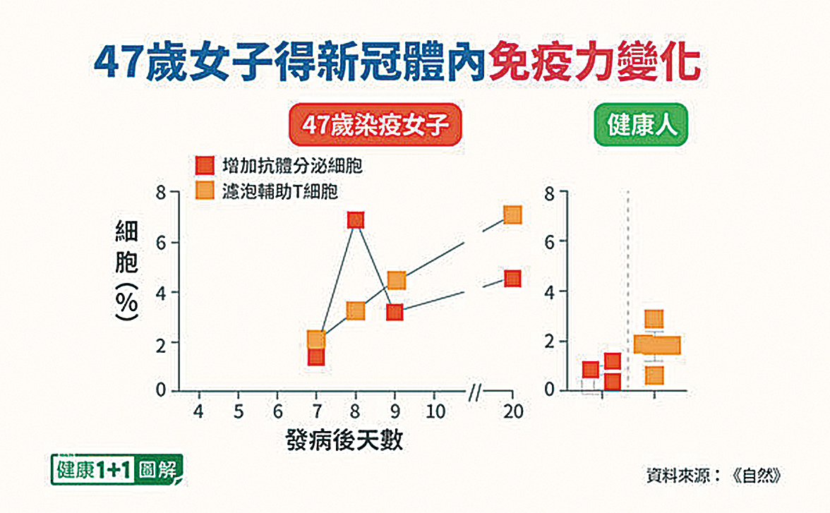 研究人員紀錄了她從發病開始直到20天後的免疫學指標。第7天,她體內的「增加抗體分泌細胞」和「濾泡輔助T細胞」已經出現,到20天後的康復期,這兩種細胞還是維持在比較高的水準。