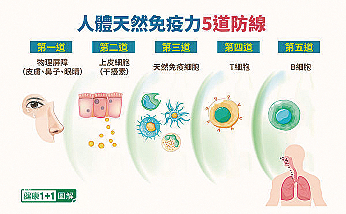 人體的免疫力對付外來的病毒、細菌等等,有五道屏障。
