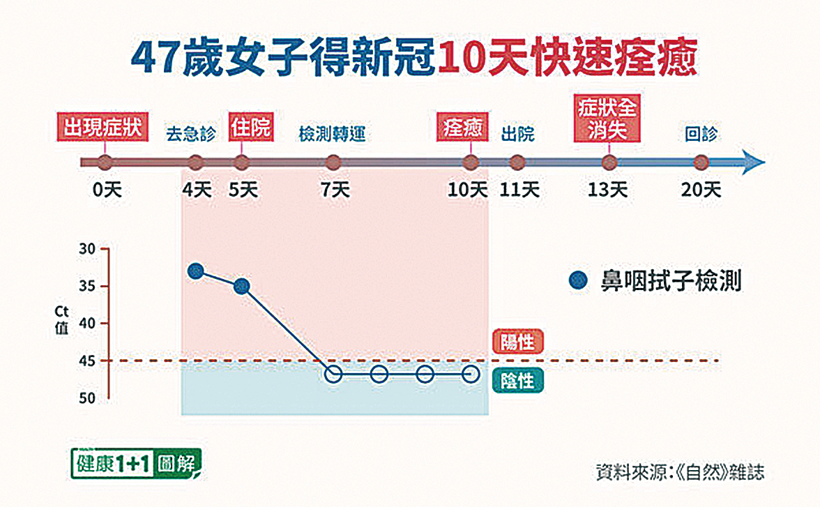 這個女性的案例說明,人們得新冠(中共病毒肺炎)以後,自身免疫健全的話,就算不用任何藥物,也能夠成功的清除病毒。