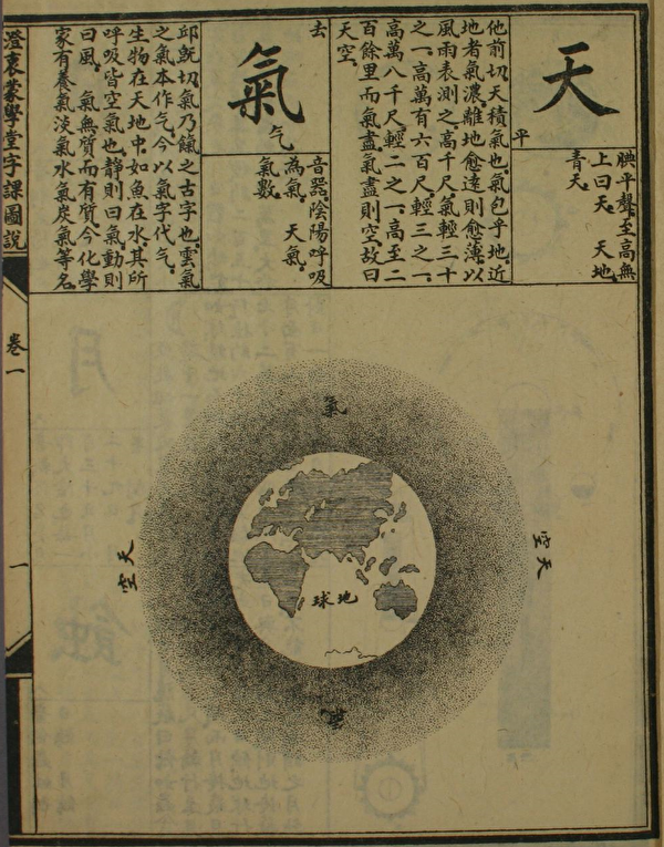 《字課圖說》天:至高無上曰天。天積氣也。氣包乎地,近地者氣,離地愈遠則愈薄。以風雨表測之,高千尺,氣輕三之一,高萬八千尺,輕二之一,高至二百餘里而氣盡,氣盡則空,故曰天空。