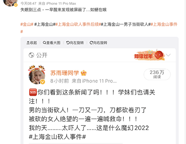 上海封城兩個月後,6月剛「解封」,多個行政區11日又開始同步核酸篩查,網絡熱傳又要封城。6月10日,上海金山區爆砍人血案,一名女子被當街砍死。但官方未通報,微博話題遭壓制。另外當天上海還傳出另兩宗砍人案。