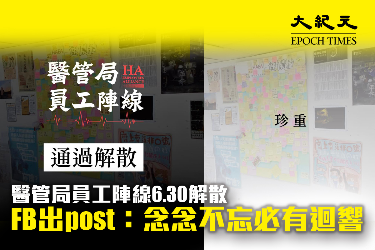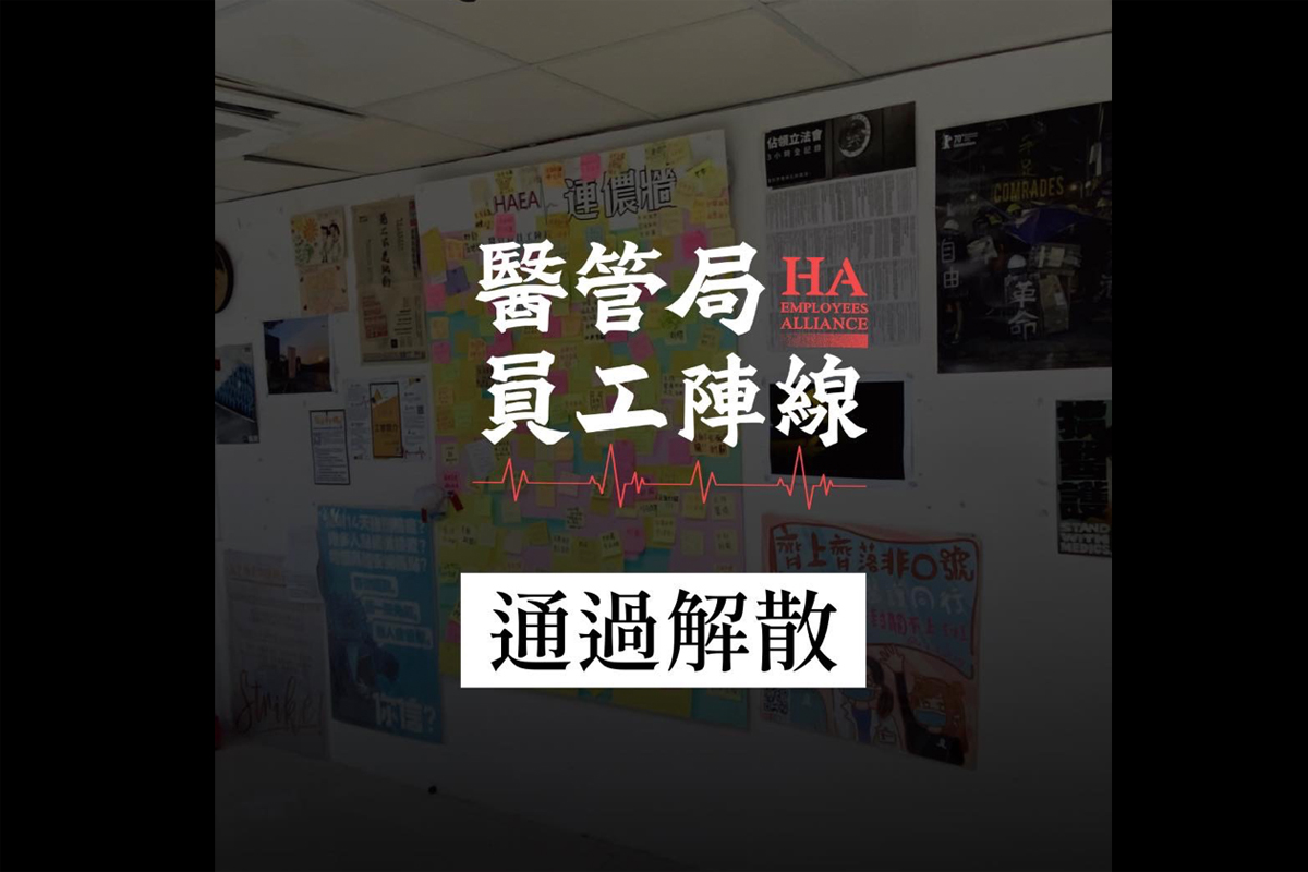 醫管局員工陣線(HAEA)於今日(26日)在Facebook上宣布,將於本月30日正式解散。HAEA指,自2019年以來,工會一直是政權著手打擊的對象,在各方的壓力,以及政治低氣壓下,最終通過動議宣告解散。HAEA又感謝各位同行者一直的支持,並直言「我們並不後悔當初選擇站在風暴的前緣,連結各位,在荒謬的時代作出抵抗。」