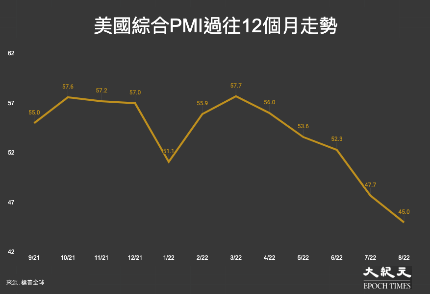 標普全球昨天(23日)公布最新美國綜合PMI(採購經理指數)初值,8月份錄得45.0,相比上月47.7出現較顯著回落,連續兩個月低於50的榮枯線,反映景氣處於緊縮狀態。