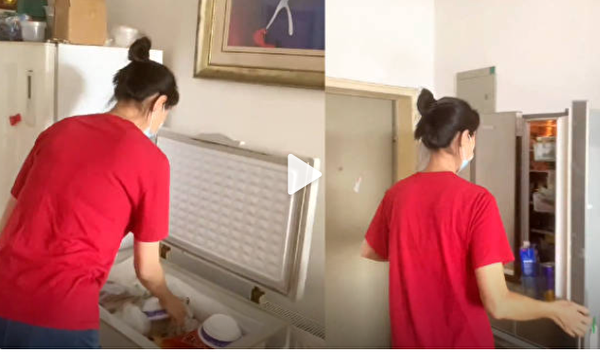 影片可見,這名身穿紅上衣的女子在各個房間內,打開一台又一台的雪櫃取出各種食物。