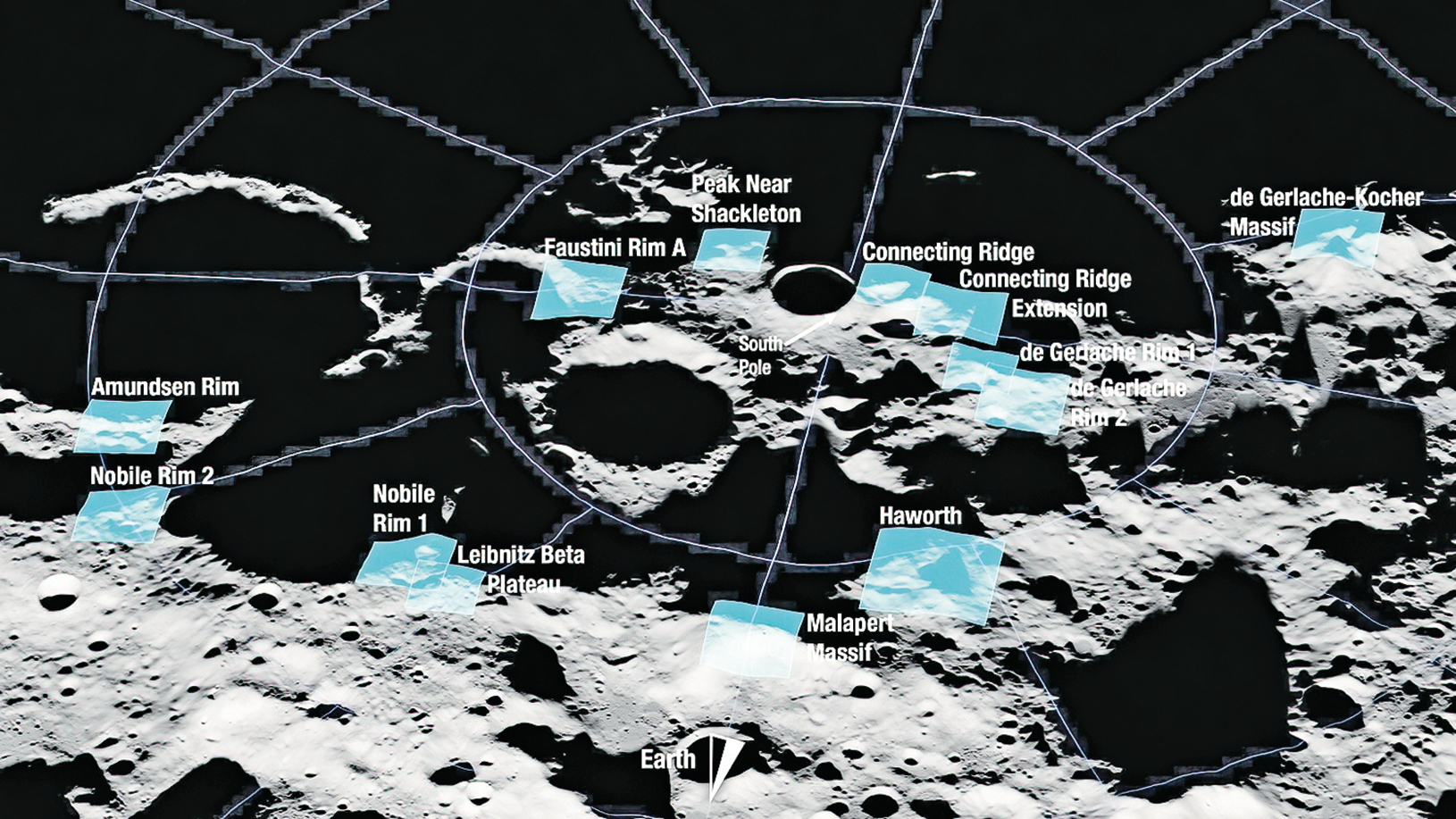 美國太空總署(NASA)計劃在2025年底將太空人送回月球,並希望在月球上收穫大量的冰。NASA近日公布了13個可能的著陸區域,它們都位於月球南極附近,並且多處於陰暗的隕石坑的邊緣或山脊上。行星科學家認為這些隕石坑含有冰層和其它各種可用的資源。