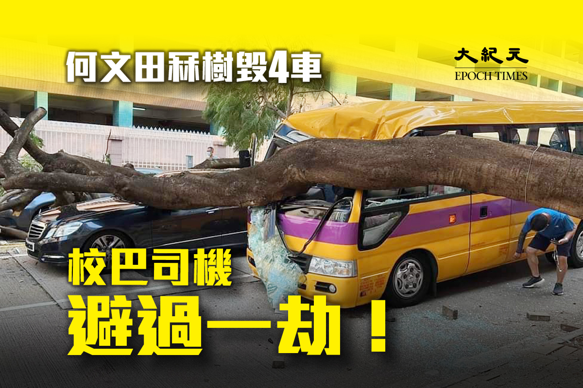今早一棵約10米高的大樹突然連根拔起,横塌向馬路中的1輛校巴及3部私家車,當中校巴擋風玻璃被大樹壓毀,車頂凹陷。