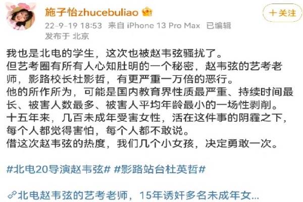 此事沒多久,19日,擁有146萬粉絲的網紅「施子怡」在微博上爆料稱,自己被北京電影學院趙韋弦騷擾,但藝考圈有所有人心知肚明的一個秘密,趙韋弦的藝考老師、知名編導類藝考機構影路站台校長杜英哲,有更嚴重一萬倍的惡行。