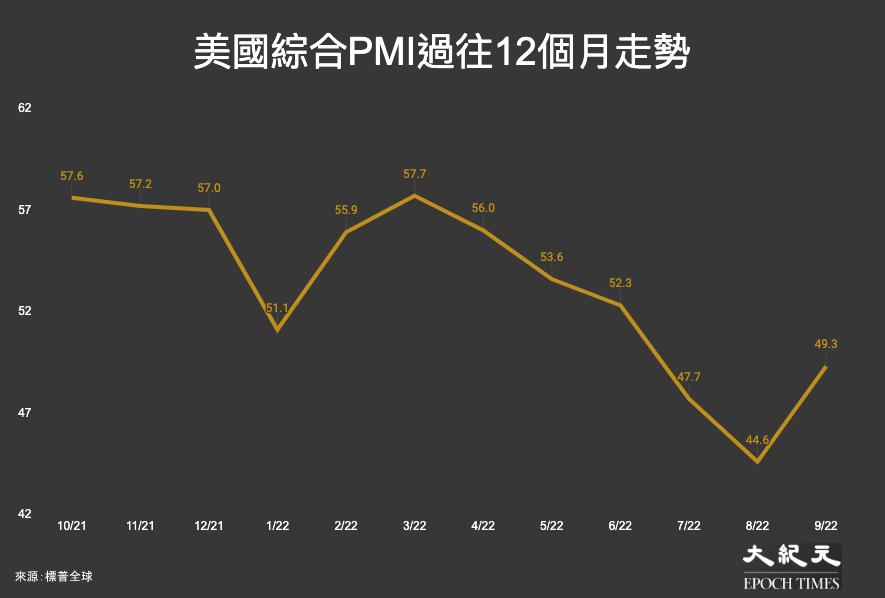 標普全球昨天(23日)公布最新美國綜合PMI(採購經理指數)初值,9月份錄得49.3,相比上月44.6顯著增強,惟仍低於50的榮枯線,反映景氣處於輕微緊縮狀態。