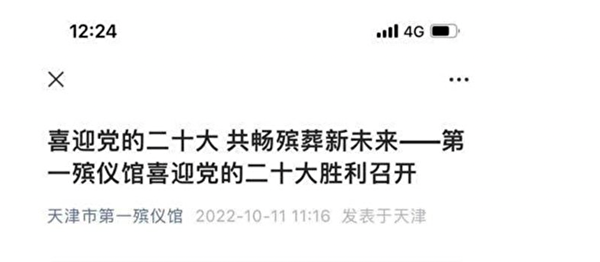 10月11日,天津第一殯儀館在微信公眾號發文《喜迎黨的二十大 共暢殯葬新未來》。文中寫道:「迎著新朝陽,開啟新徵程。在黨的二十大即將召開的神聖節點上,我們回顧過去,展望未來,相信在黨的正確領導下,天津殯葬必將迎來更加輝煌的明天。」
