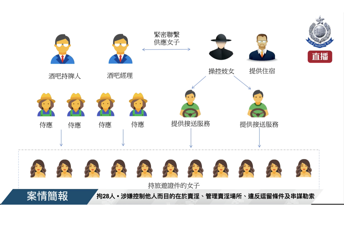 上述被捕人士涉嫌「經營賣淫場所」、「協助經營賣淫場所」、「違反逗留條件」、「控制他人而目的在於賣淫」、「協助控制他人而目的在於賣淫」及「串謀勒索」等罪名。