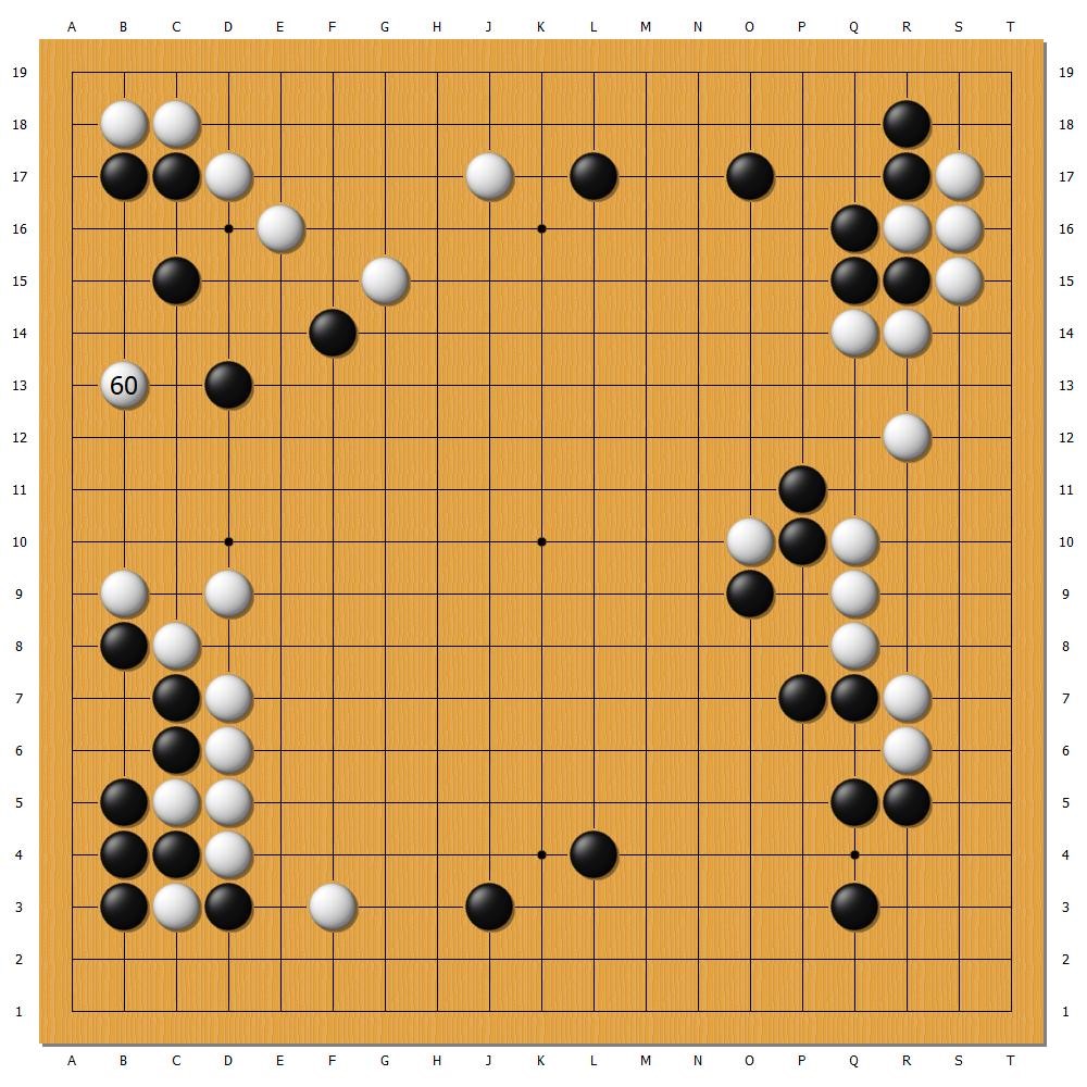 陸敏全對上野愛咲美的力量有所忌憚,因此穩紮穩打,儘量將自己的棋走厚。白60二路點,破眼搜根,上野愛咲美發力開始對唯一尚不安定的左上黑棋展開攻擊,然而黑棋先前封蓋右側白棋在四路圍空,整個黑子都走在了外面,與左上黑棋遙相呼應,因此白棋對左上黑棋無法構成實質威脅。