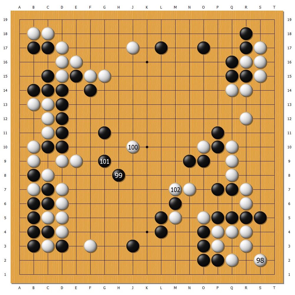 實戰下至白98手,上野愛咲美掠去黑右下角實地,後手做活,黑棋則在外側構築模樣,且白左下角蜿蜒巨龍並未安定,局勢已是黑棋明顯優勢。於是白100手毅然打入黑中腹,放出勝負手,希望能在治孤中將黑棋中腹模樣洗劫一空,實屬鋌而走險。
