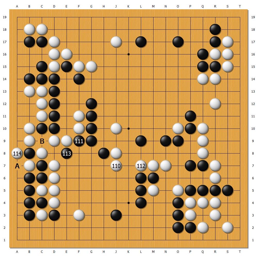 陸敏全111位擠、113扳,在對中腹白棋進行攻擊的同時,不忘壓迫左下白龍,想法很好。但是卻忽略了先於A位提掉白二路一子的絕對先手,如果黑棋先於A位提,白只能於B位接,此時如再下黑111擠、113扳,則白大龍幾乎沒有眼位,會給上野愛咲美帶來很大壓力。但實戰中被白機敏地於114位提掉黑一子,白棋大龍生死已基本無憂,這在心理上成為白棋逆轉本局的轉折點。