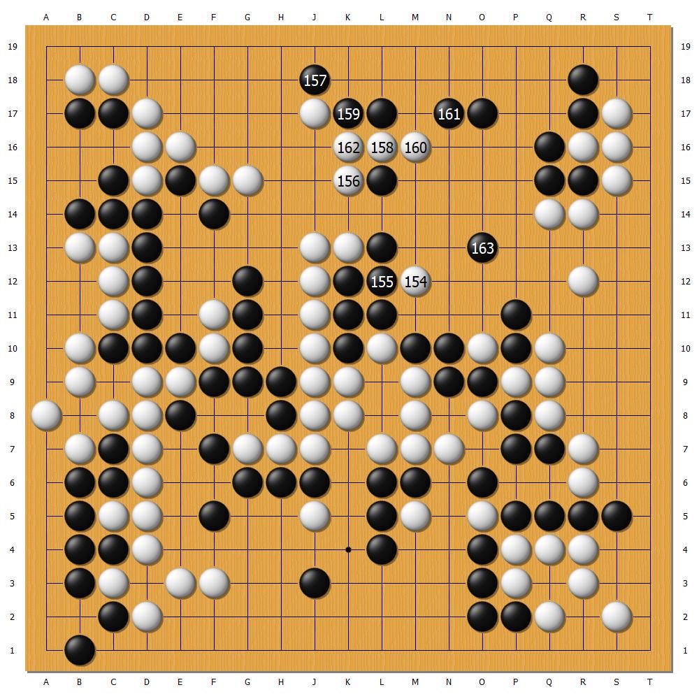 本局比賽上野愛咲美的時間優勢依然十分顯著,布局和中盤階段很多棋都是秒下。當陸敏全進入讀秒時,上野愛咲美還有35分鐘的基本用時,因此在中腹的戰鬥中更有時間算清變化。黑棋在攻擊左下白棋無果的情況下,轉而追殺中腹白棋,但畢竟讀秒聲中無暇細算,沒有走出最佳的攻擊手段,白中腹大龍順利與左上白棋匯合。此時黑原先的中腹模樣並未轉化成多少實空,至黑163手,白棋已經逆轉之前的劣勢,雙方局面非常接近。
