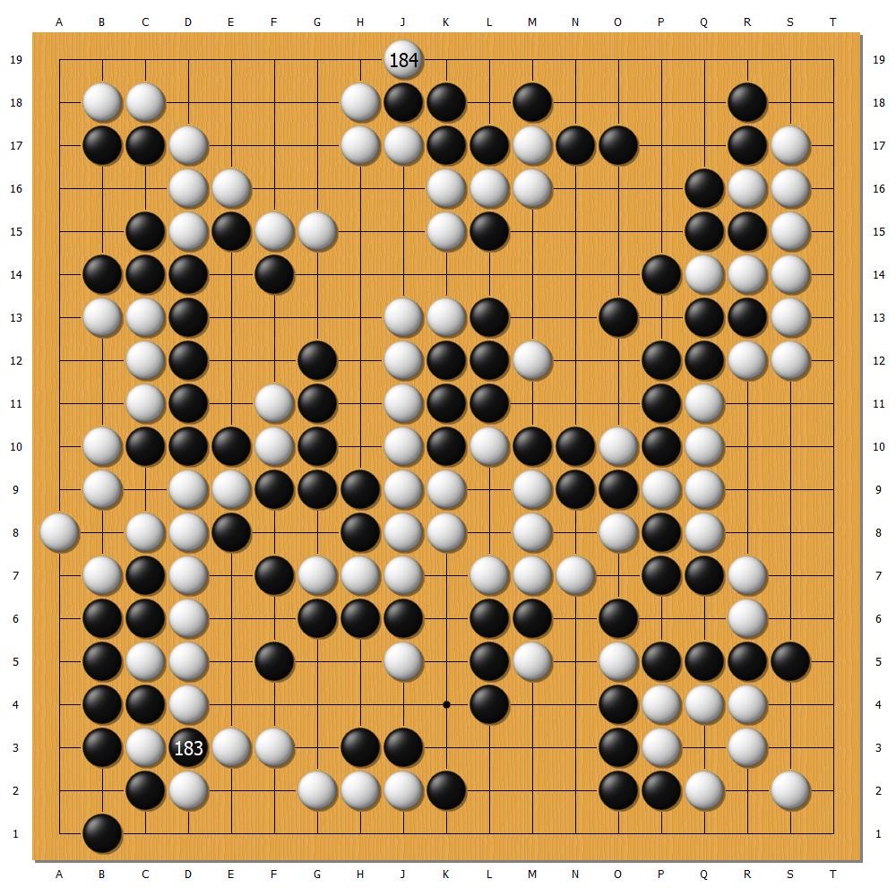黑183手提劫,仍然覬覦著左下白大龍的死活,錯失了上方的大官子,是本局最後的敗招,被白184搶先逆收後,白棋一舉奠定勝局。