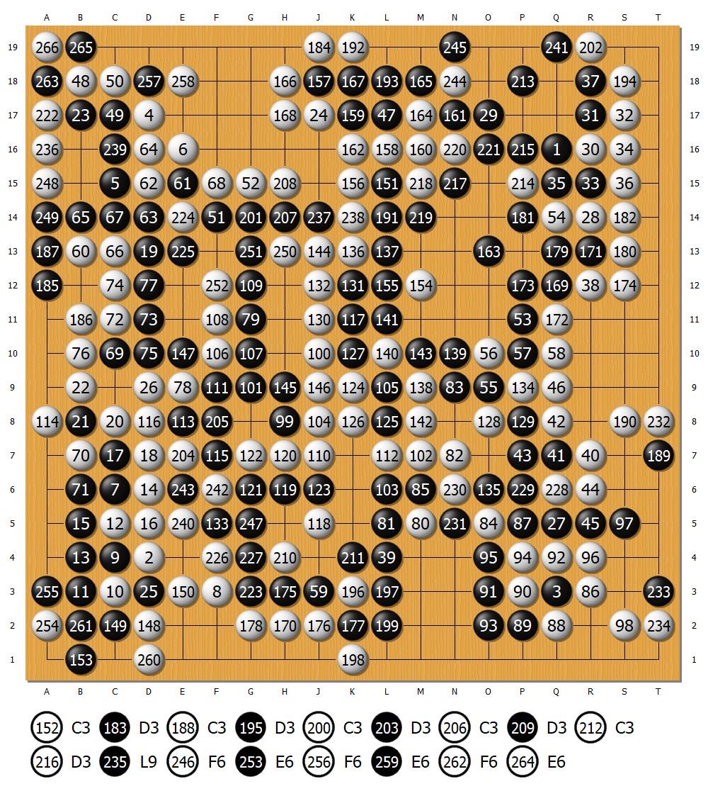 此後白棋胜勢不可動搖。黑棋在最後讀秒聲中再次犯錯,被白棋將左上大塊黑棋弄成劫殺,最終黑大龍憤死而告終,但其實對勝負已經沒有影響。行至白266手,陸敏全投子認負。