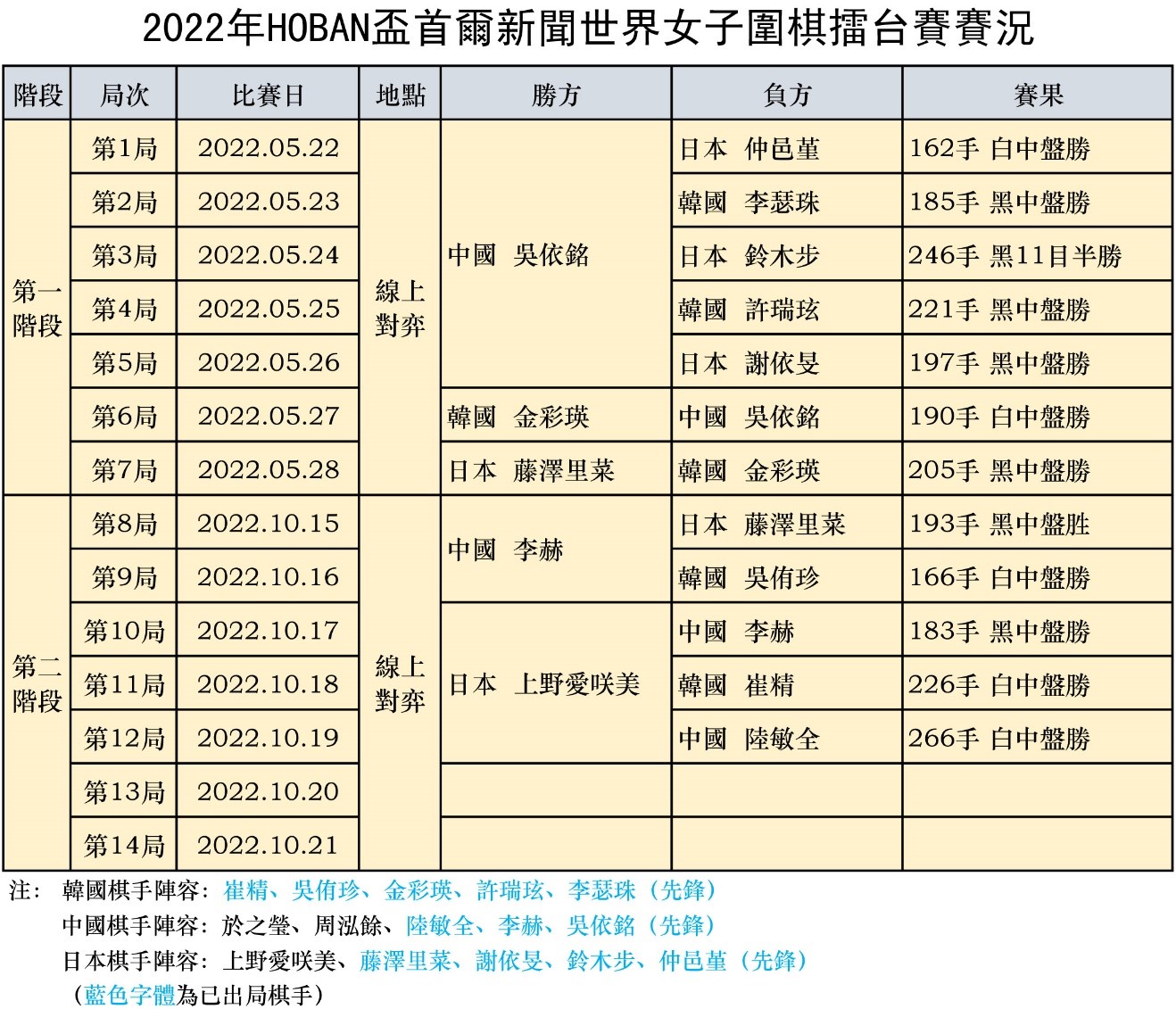 10月19日,「2022年HOBAN盃首爾新聞世界女子圍棋擂台賽」第12局比賽結束,日本主將上野愛咲美四段執白266手,中盤戰勝中國的陸敏全六段,取得三連勝並喜獲個人連勝獎。
