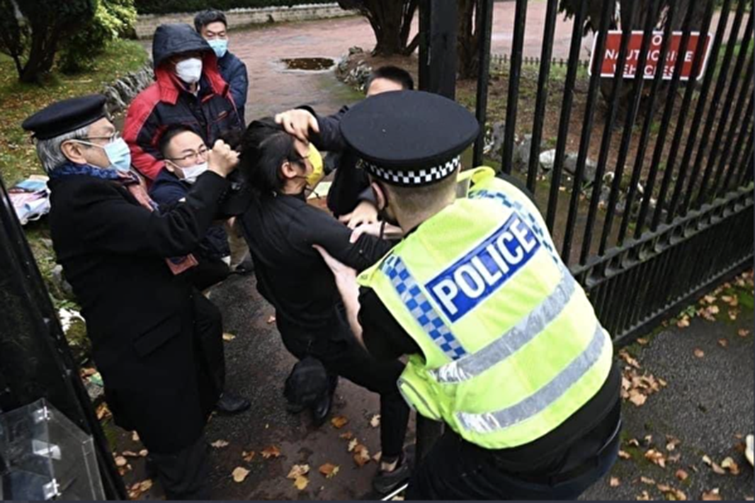 如今到了二十一世紀二十年代,中共戰狼已經按捺不住稱霸世界的躁動,不滿足於口頭的強硬,而直接到別國內動手施暴了。從影片中我們可以清晰地看到,那個中共駐曼徹斯特領館的總領事鄭曦原率先衝出領館,腳踢、手撕示威標語,氣焰極為囂張,當事態逐漸失控,場面極為混亂時,領事館的一群「外交官」主動出擊,居然將一名港人拖進館內群毆。警察開始有點猶豫不決,不知是否需要進入館內搶人(英國警察可能沒見過如此強悍的「外交官」——外交官乎?暴徒乎?),到最終看到事態嚴重,如果不把人救出,啥事都可能發生時,不得不上演了一場撕扯大戲,把人拽出館外,那群外交官此時才悻悻地走開。