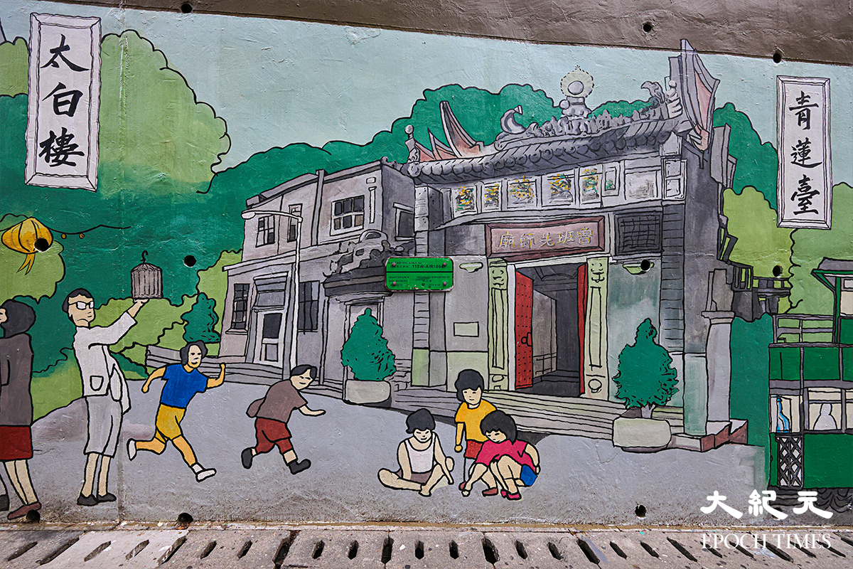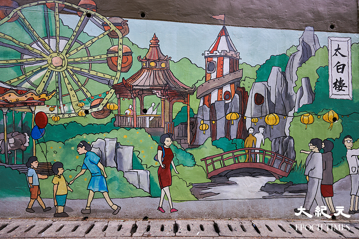 壁畫中呈現的「太白樓」,是堅尼地城百年前曾出現的中西合璧遊樂場,由香港開埠初期富商李陞的兒子李寶龍投資興建,既有新式的旋轉木馬、摩天輪等機動遊戲,也有中國傳統的詩壇、燈謎等節目,由於他酷愛李白的詩詞,故此以其別字太白作為遊樂場的名字。