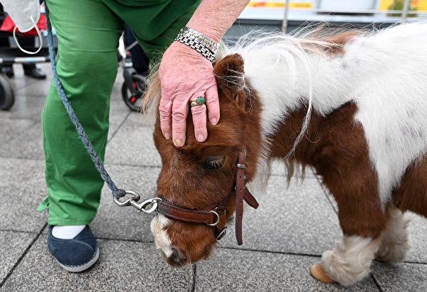 圖片顯示,10月21日,魏德曼帶著三匹設得蘭(Shetland)小馬:普穆克爾、戈爾迪(Goldi)及萊恩(Lion)前往療養院陪伴老人。#