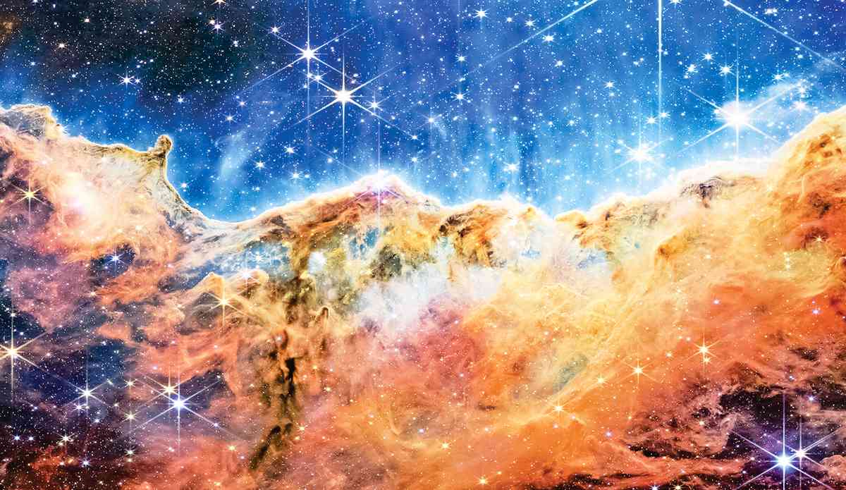 這張圖片就是韋伯太空望遠鏡拍攝的「船底座星雲」(Carina Nebula)的圖片,從中可以看到恆星的誕生。其壯觀景象被美國太空總署形象地稱為「宇宙懸崖」(cosmic cliffs)。