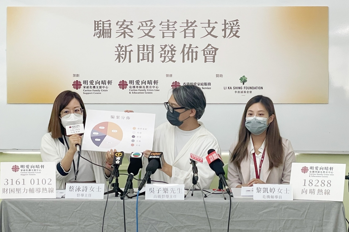 明愛向晴熱線在今年4至9月,接到153宗與騙案相關的求助,當中7月至9月的求助數字更有上升趨勢。機構分析受害人的財政受疫情影響,急需賺錢故墮入騙局,令近期求助數字上升。調查又發現求助個案中,每5人就有一人有自殺風險。