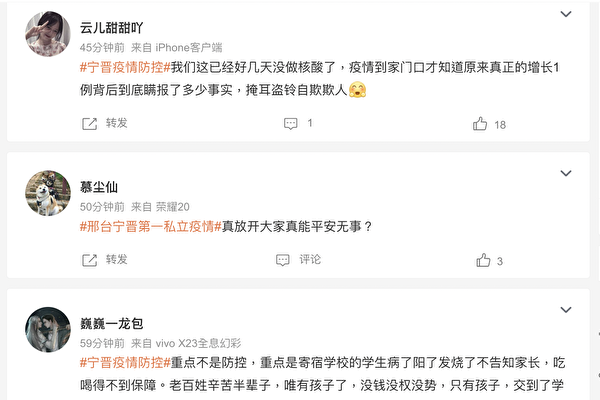 「北海有魚iu」:河北省邢台市寧晉縣疫情瞞報,導致現在很多學生在學校發燒、陽性,學校不管,學生走路回家。疫情當下縣領導不作為,只想瞞著。這麼多人的死活就不重要嗎?民生物資得不到解決,從十月底封城到現在,真的就沒人能看到嗎?學生在學校安全得不到保障,在學校發燒老師不讓告訴家長,直接把發燒的學生送回家。不管學生死活,方艙醫院已經住滿人了!