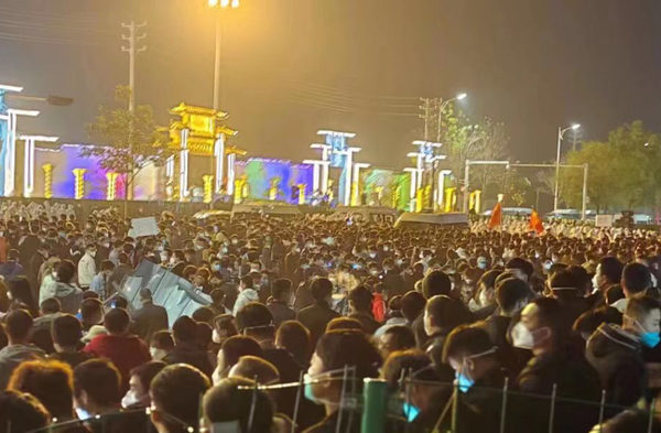 據希望之聲電台報道,網上熱傳的多個影片顯示,大量工人和身穿白色防護服的警察爆發激烈衝突,警方一度發射催淚彈,持長鋼管毆打工人,工人則丟擲石塊,拿出滅火器反擊,還砸毀車輛與核酸檢測亭。期間,有人喊出「打倒中國共產黨」、「為甚麼不讓說,必須要說,今天我不說,明天沒有人講,中國共產黨就可以把我們的命不當命嗎?!」