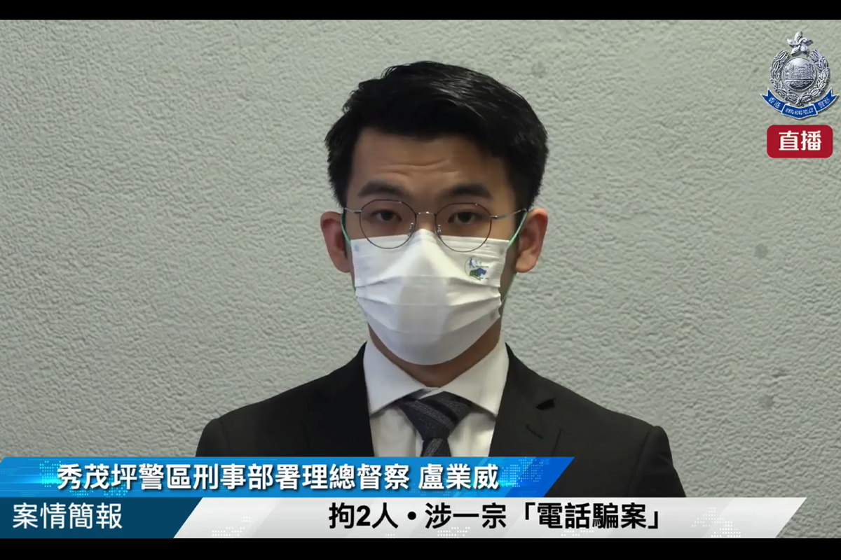 秀茂坪警區刑事部署理總督察盧業威今日(9日)向傳媒交代案情,指12月7日一名居住於屯門區的81歲女子收到騙徒來電,冒認是她的孫兒,表示遭到拘捕及需要保釋金。受害人依照騙徒指示乘的士到秀茂坪區一個巴士站,將7,000元現金交予騙徒。幸得一名熱心的士司機目擊事件及時報案,警方到場拘捕一名39歲及一名49歲本地男子,並即場起回款項。