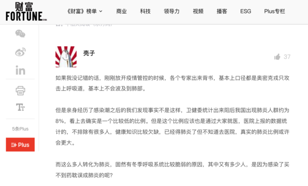 筆名為「殼子」的作者,在「財富中文網」發文說,「如果我沒記錯的話,剛剛放開疫情管控的時候,各個專家出來背書,基本上口徑都是Omicron只攻擊上呼吸道,基本上不會波及到肺部。但是親身經歷了感染潮之後的我們發現事實不是這樣,真實的肺炎比例或許會更大。」