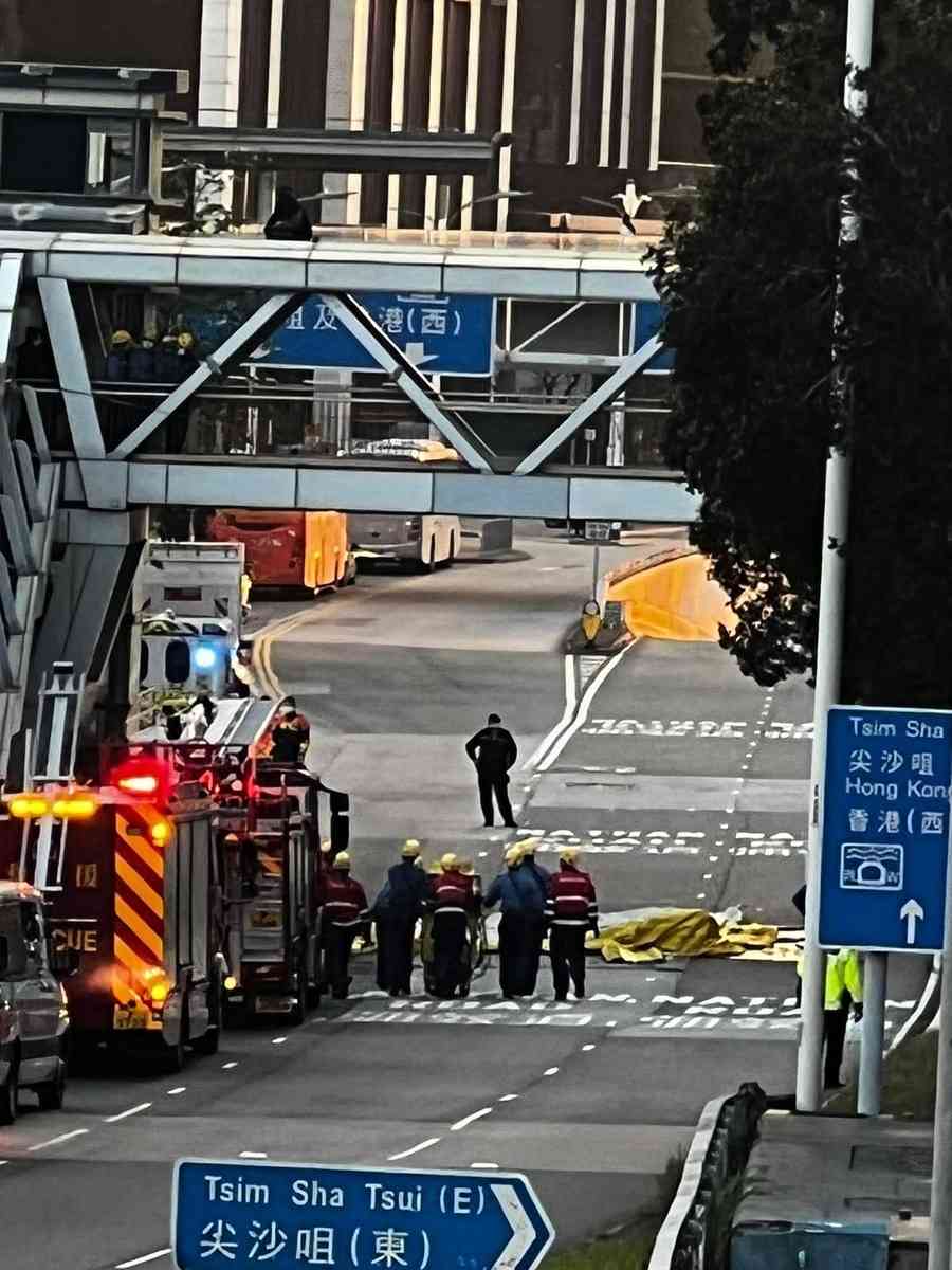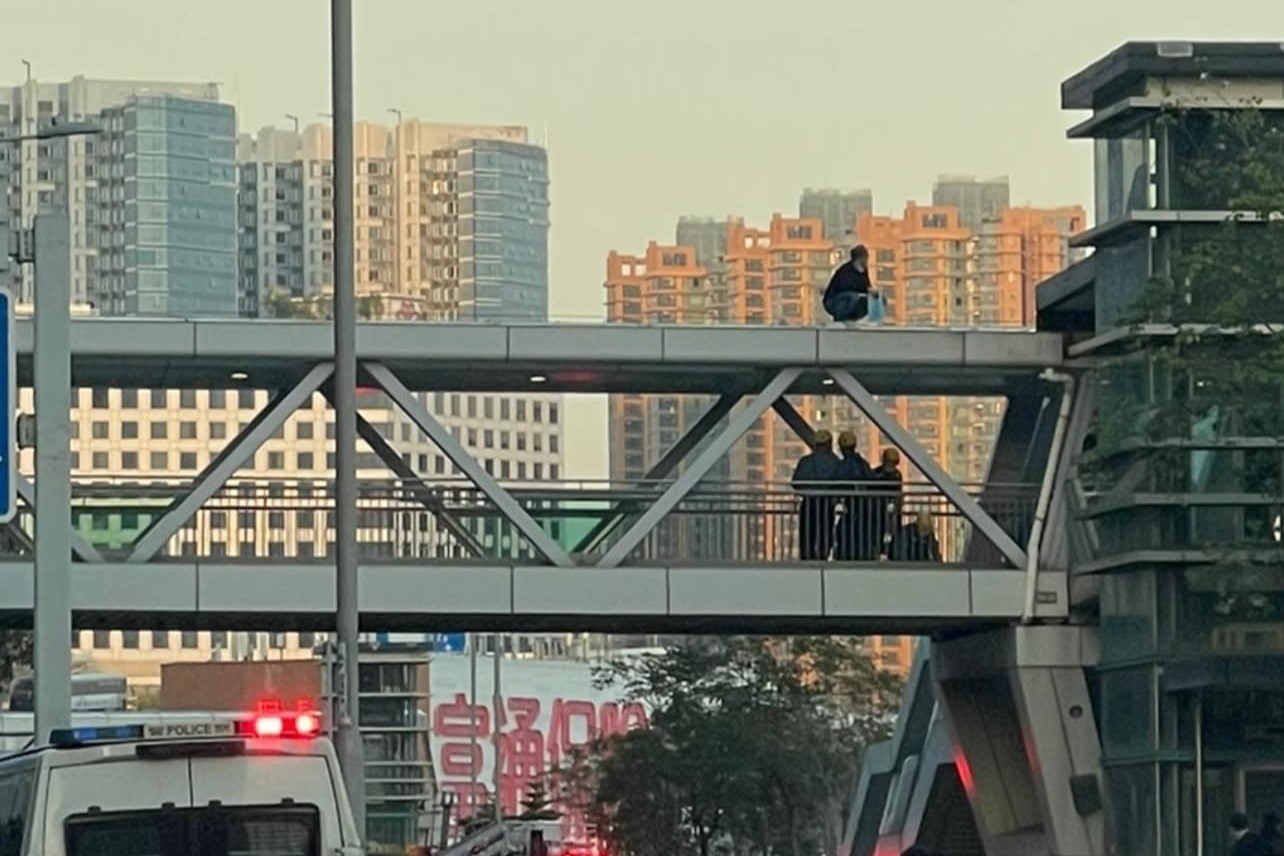 尖東梳士巴利道今(18日)午發生企跳事件。一名全黑穿著的男子,傍晚5時許突爬上連接梳士巴利道花園至海濱的行人天橋危坐,企圖跳橋。警方接報立即趕至現場,派出談判專家遊說,消防亦展開救生氣墊戒備。直至傍晚6時許,救援人員趁事主分神,遂一擁而上把他制服帶返安全位置,後送院檢查。