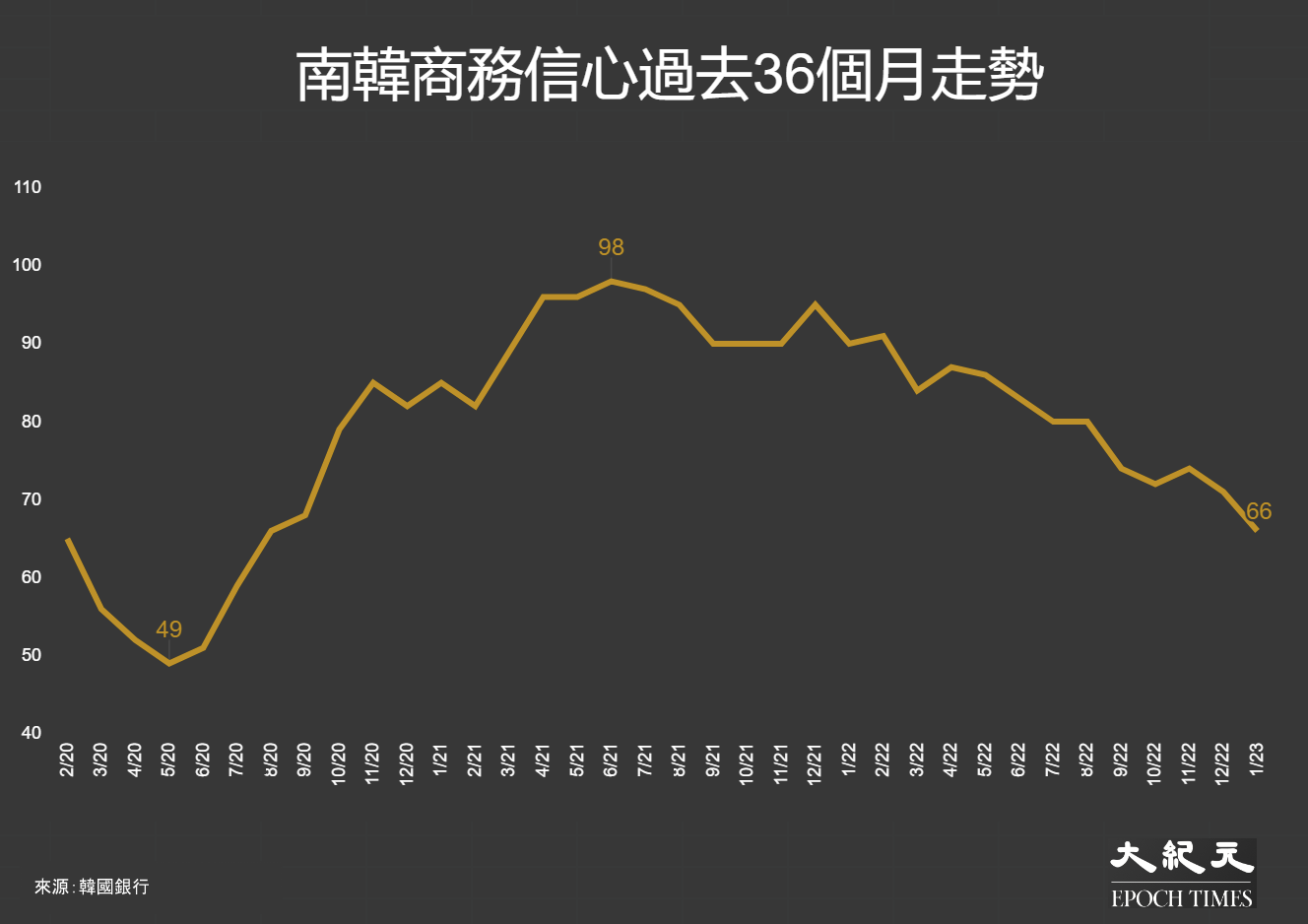南韓銀行今天(27日)公布最新商務統計指數(Business Survey Index,BSI),製造業從12月份的71點下降至1月的66點,創自2020年8月以來新低,前瞻一個月的數值報65點。BSI的最高值為200,最低為0,而100是中位數,較高即屬「樂觀」,較低便是「悲觀」。