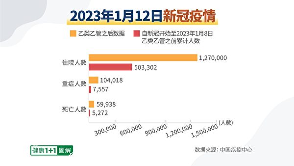 中共疾控中心,2023年1月5日報告現有確診病例92,184宗;2023年1月12日,新冠病毒感染現有住院病例127萬宗。確診病例不一定全部都能住院,所以1月12日的確診病例數應該遠大於住院的127萬。